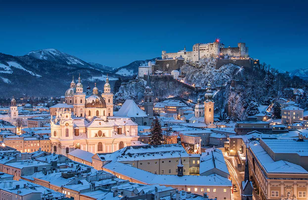 Salzburg Cathedral and famous Festung Hohensalzburg illuminated in beautiful twilight during Christmas, Image by canadastock, shutterstock