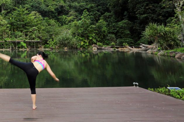 - A woman kickboxing on decking by the geothermally heated pool at the heart of Banjaran Hotsprings Retreat